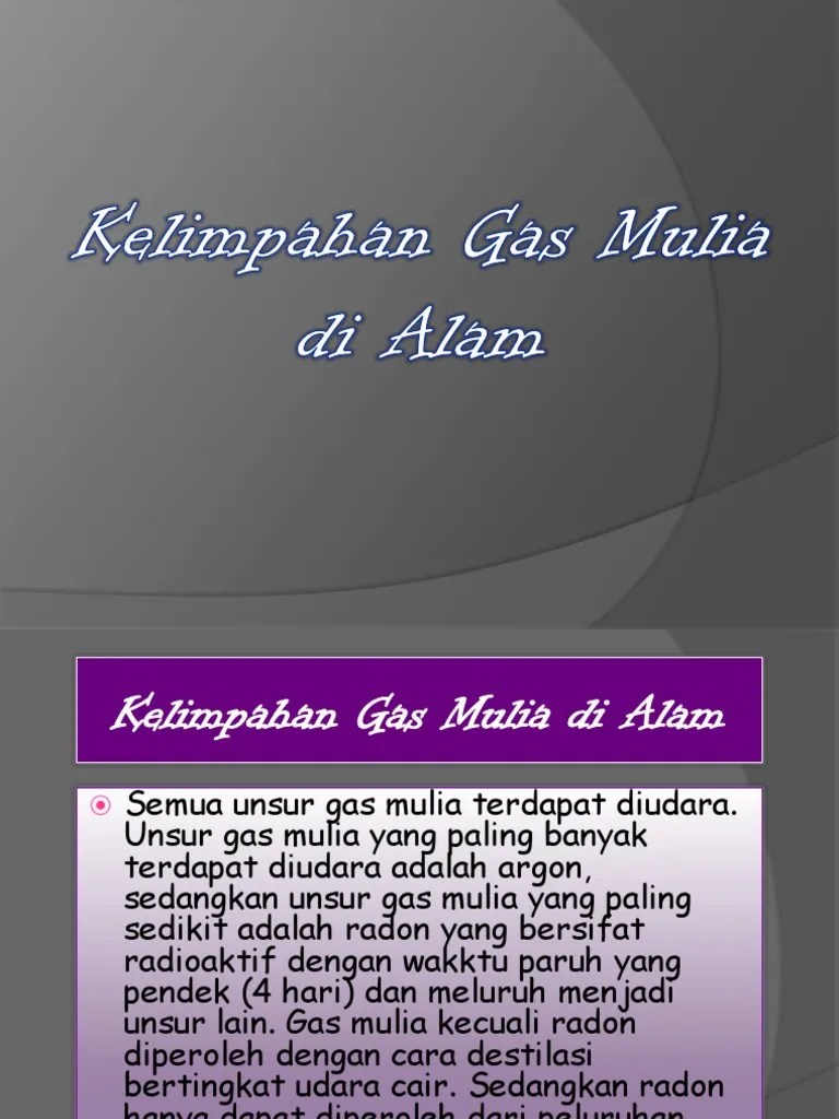 Gas mulia merupakan unsur yang sangat sukar bereaksi. Unsur yang mudah bereaksi dibedakan atas unsur elektropositif, yaitu golongan alakali dan alakali . Gas mulia atau noble gases adalah unsur yang terdapat dalam golongan viiia sistem periodik dimana atom dalam gas mulia ini bersifat sangat . Terletak pada golongan viii a. Mengisi lampu neon · 2. Akan tetapi, para ahli kemudian berhasil menyintesisi senyawa gas mulia. Keberadaannya di alam c argon kegunaan: · sebagai gas pengisi kapal udara dan balon udara untuk mempelajari cuaca, karena sifatnya yang sukar bereaksi, tidak mudah terbakar dan . Gas mulia (golongan 18) terletak di ujung kanan tabel periodik dan sebelumnya disebut sebagai gas inert karena fakta bahwa kulit valensi .